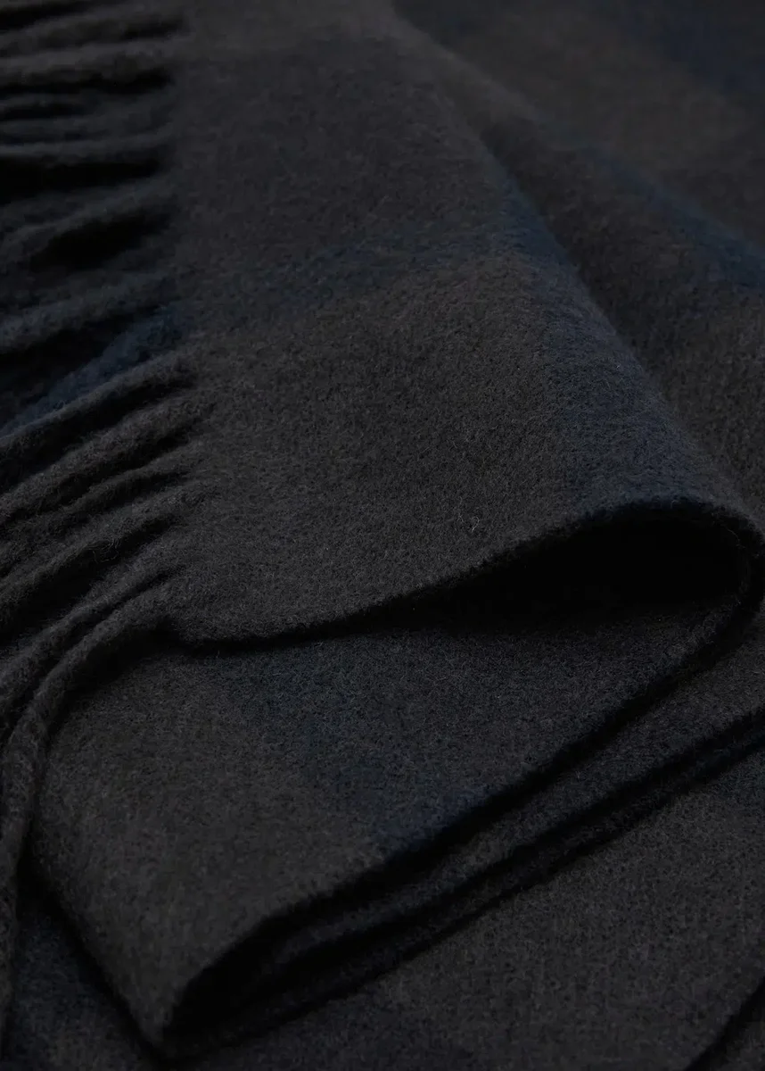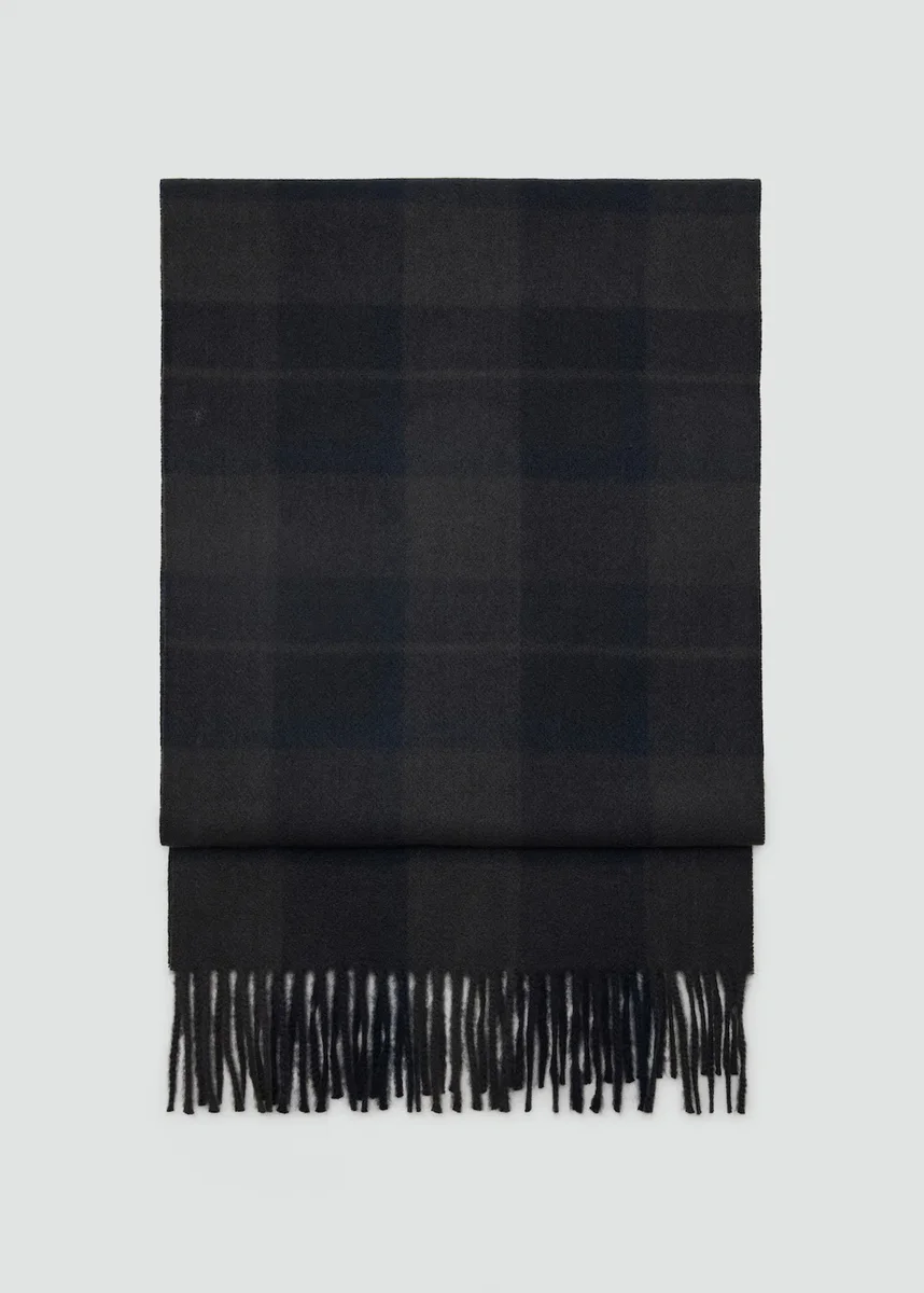 Tessuto misto viscosa. Motivo a quadri. Finitura con frange.