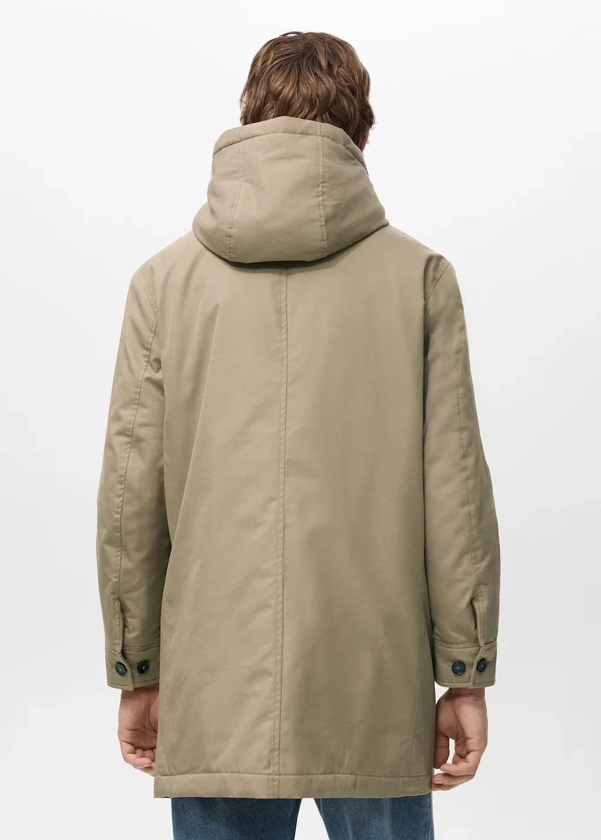 Esclusiva online. Idrorepellente: tessuto tecnico idrorepellente. Design trapuntato. Cappuccio con fodera in shearling. Due tasche laterali con bottoni. Tasca interna. Chiusura frontale con zip e bottoni. Maniche lunghe con polsini con bottoni. Due tasche laterali con patta.